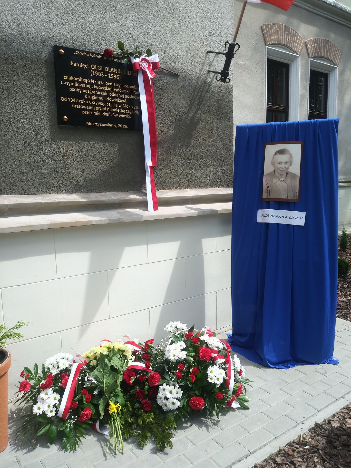 „Pamięci Olgi Blanki Lilien (1903–1996), znakomitego lekarza pediatry, pochodzącej z asymilowanej, lwowskiej żydowskiej rodziny, osoby bezgranicznie oddanej posłudze drugiemu człowiekowi, od 1942 roku ukrywającej się w Mokrzyszowie, uratowanej przed niemiecką zagładą przez mieszkańców wioski”.