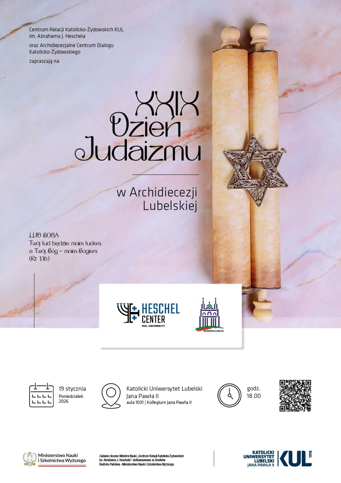 Centrum Relacji Katolicko-Żydowskich KUL im. Abrahama J. Heschela KUL oraz Archidiecezjalne Centrum Dialogu Katolicko-Żydowskiego zapraszają na obchody XXIX Dnia Judaizmu w Archidiecezji Lubelskiej. Wydarzenie odbędzie się w poniedziałek 19 stycznia 2026 r. o godz. 18:00 w auli 1031 Collegium Jana Pawła II na Katolickim Uniwersytecie Lubelskim Jana Pawła II.